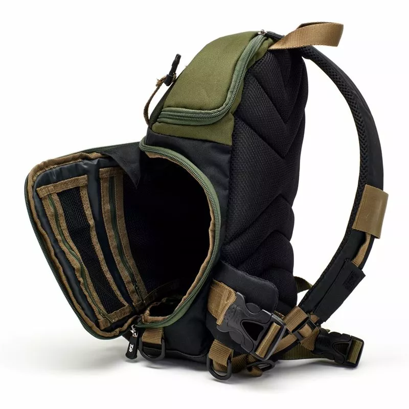 - Mobile anglers will enjoy the portability of this backpack! Useful when wading down rivers when you can utilise the shoulder strap that rotates around so you can easily locate the accessible main pocket. The 90° zip helps navigate inside, as this extends around to make retrieving larger items easy, especially when you’re holding your rod!