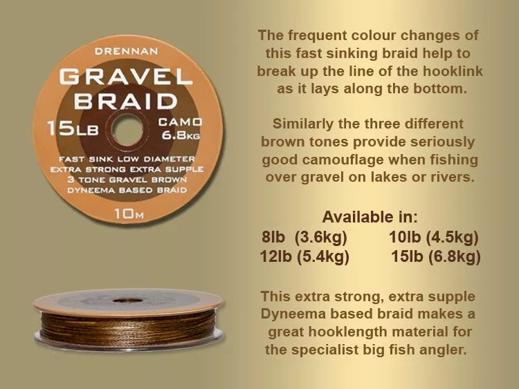 - The frequent colour changes of this fast sinking braid help to break up the line of the hooklink as it lays along the bottom. Similarly the three different brown tomes provide seriously good camouflage when fishing over gravel on lakes or rivers. This extra strong, extra supple dyneema based braid makes a grat hooklength material for the specialist big fish angler. Available in 8lb,10lb,12lb & 15lb.