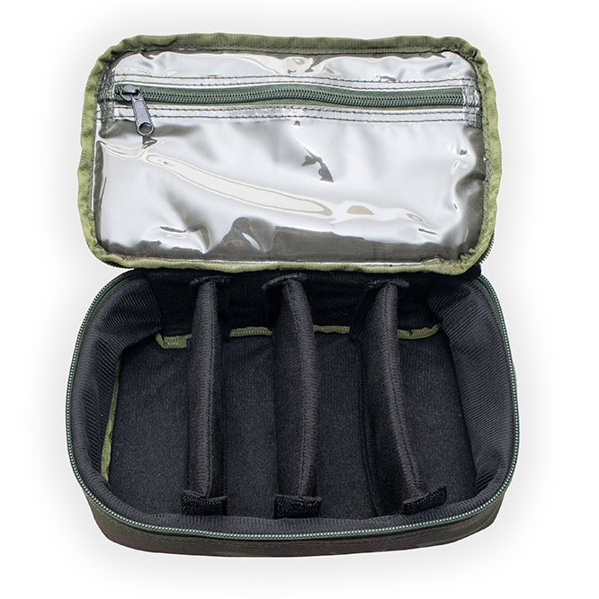 - Zipped and padded throughout, with padded dividers separating the main compartments and a re-enforced base. There’s even a zipped clear PVC pocket on the inside of the lid that’s perfect for keeping licenses, spare leaders or swivel and clip attachments for your leads.