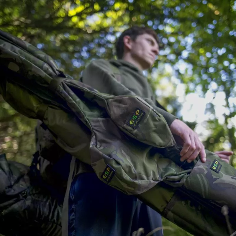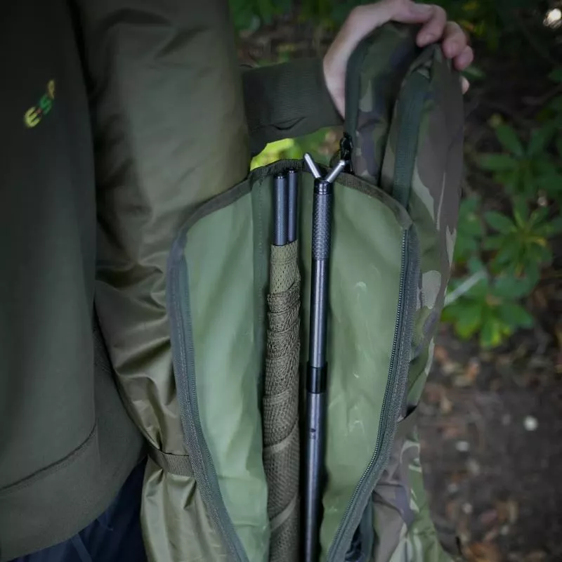 A secure and compact transport solution designed to comfortably carry your set of matching Quickdraw rods and accessories, plus a brolly. Manufactured from tough 600D PU backed polyester finished with a soft muted camo pattern. There’s a generous pocket for locating the rod buts around the base and Velcro webbing straps securing them around the top. Plus an additional zipped sleeve that encloses the rod tops and goes over the top of the quiver. In the centre there’s a larger compartment with room for a brolly, plus landing net and two additional zipped side pockets for banksticks and broken down pods. Ideally used with the Quickdraw rod sleeves.