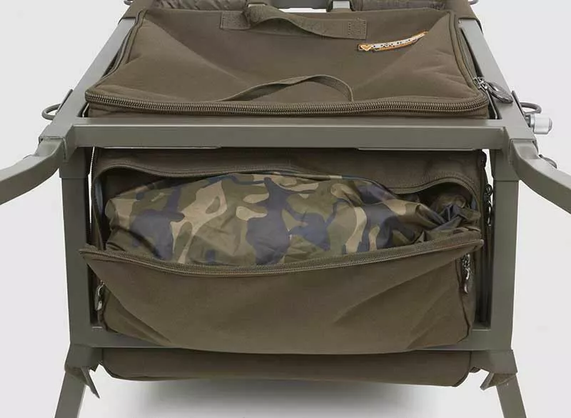 Improving upon the previous design with extra features and superior additions such as a handy under bag for easy storage. It also has a hard base and a zipped pocket to house a camouflaged waterproof rain cover which comes supplied as standard to fight off rust and ware whilst fishing. It has been built to allow anglers to fish ‘off of’ making it ideal for short-session anglers that like to keep mobile but is also equally as good for anglers that need to carry those essential extras!
