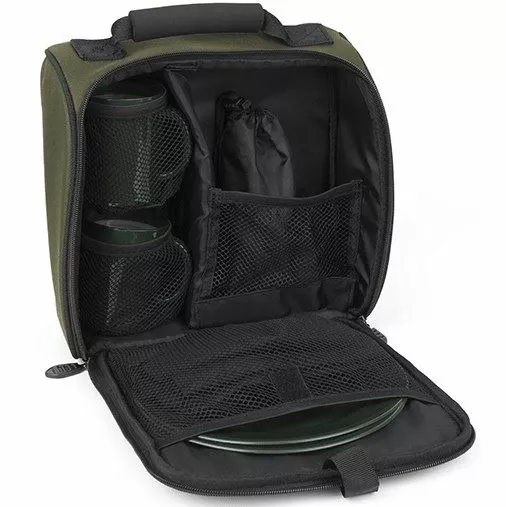 - Keep your cookware organised with this stylish bag containing 2 x stainless steel knives, forks, spoons and teaspoons, 2 x round green plates, 2 x green mugs, 1 x Corkscrew, 1 x large screw top tubs, 2 x small screw top tubs and 1 x Micro fleece towel. It’s all you’ll ever need to keep yourself fed and watered on the bank.
