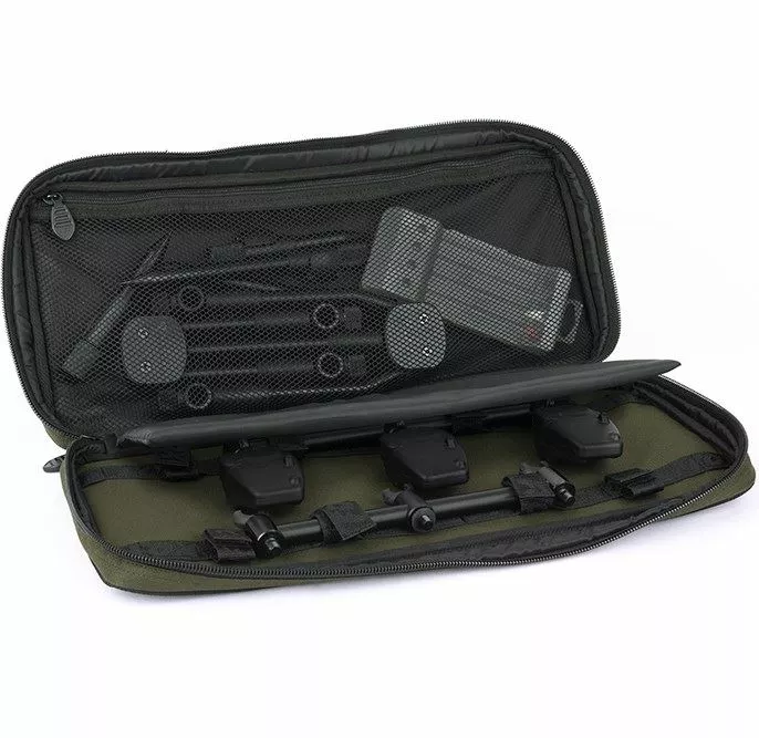- Designed for storing a 3-rod setup, its well-padded, water resistant, and contains a small mesh pocket for zipping away and protecting your alarms and hangers.