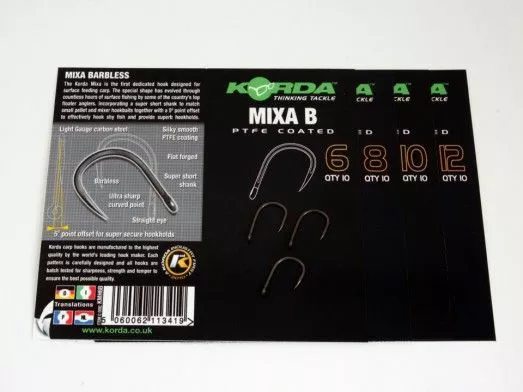 - The first dedicated floater fishing hook. These have been specifically designed to hook even the shyest feeding carp on the surface. With a short shank, wide gape, beaked offset point, they truly are made for the job. The final most noticeable point about these hooks, are their sharpness; hypodermic and piercing is the best possible explanation. So much so that the guys have been using them for all manner of carp fishing situations. The Mixa hook is available in barbed and barbless versions, in size 6, 8, 10 & 12