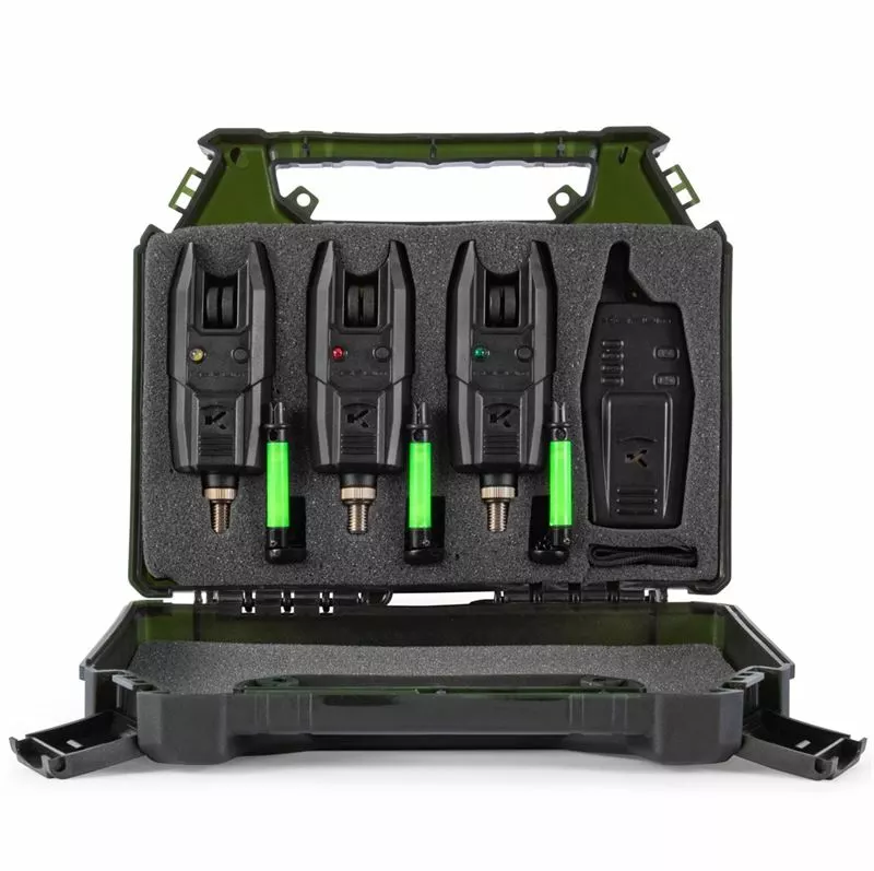 - This package contains three alarms, a wireless receiver and three green swingers, all packed into a compact carry case. Featuring a highly sensitive roller, bright LED and adjustable volume, this is everything you need for accurate bite detection.