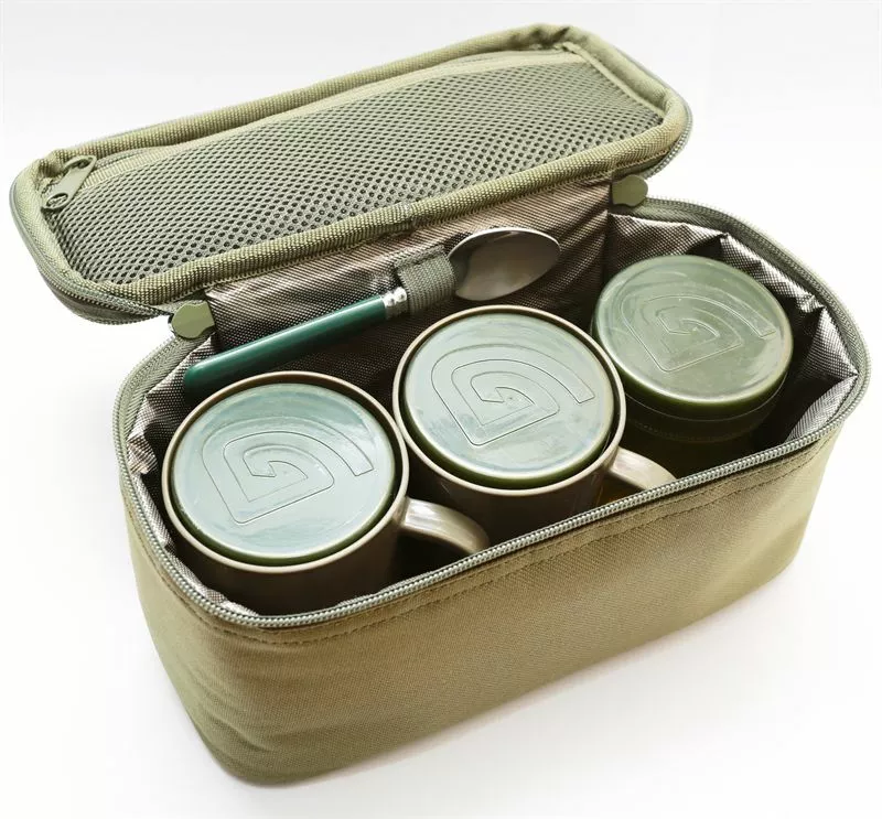 - A complete bankside hot drink kit supplied with two plastic cups, a teaspoon and three translucent pots ideal for tea coffee and sugar. All this is stored inside a foil-lined carry pouch with a zipped mesh lid.