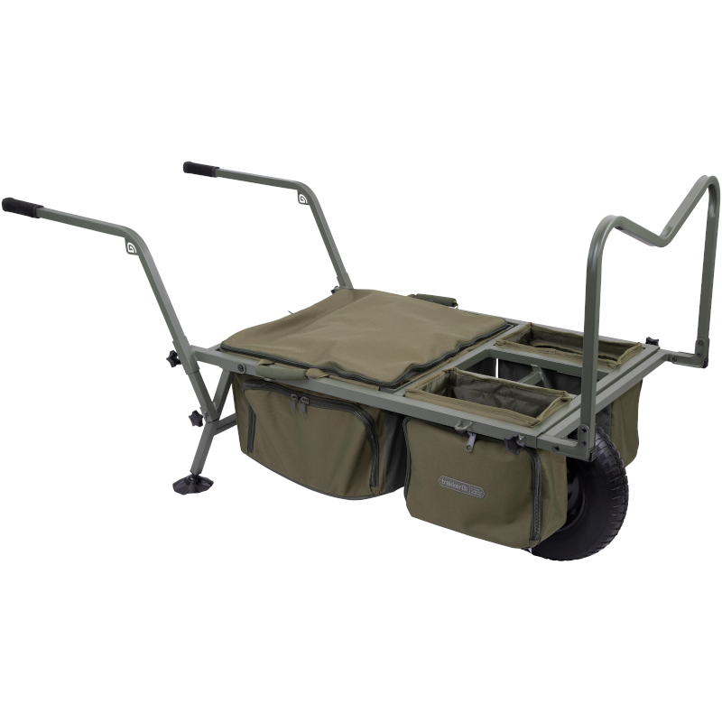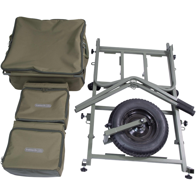 A great option if you’re pushed for vehicle space these lightweight innovative designs fold down and dismantle into a flat profile for ease of transport. As a result, they take up far less room than the other models in the range. With plenty of storage space beneath, coming with a generous main bag and twin pouches on either side of the front wheel positioned for balance. Leaving the top layer clear to take all your larger items like your bivvies, holdalls and carryalls.